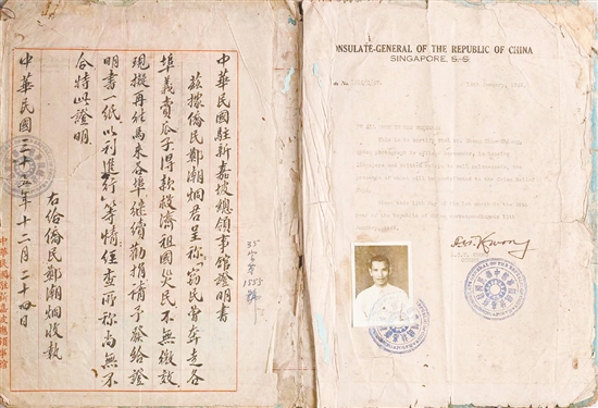 驻新加坡中华总领事发给郑潮炯的中西文证书。
