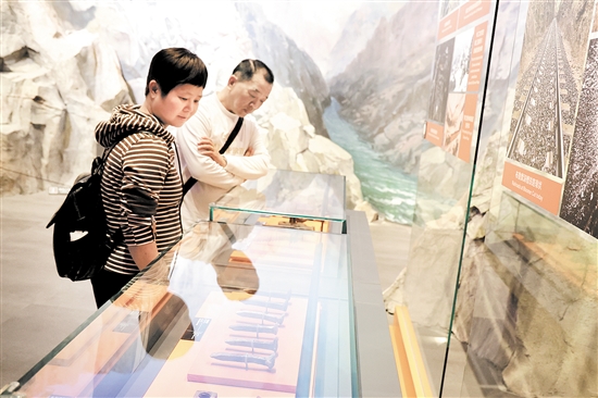游客在侨博馆参观固定展览“根在侨乡”,了解华工修筑美国太平洋铁路时使用的道钉背后的故事。