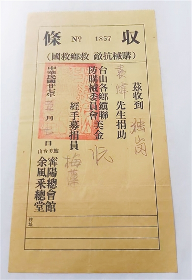 据统计,李春荣累计捐赠史料达214件(份),其中不乏极具历史价值的华侨捐款凭证,包括《纽约全体华侨抗日救国筹饷总会证明书》《华侨拒日救国后援总会捐款收条》《旅美台山宁阳总会馆、余风采总堂抗敌救乡救国捐款收条》《墨西哥尾利打抗日救国后援会捐款收条》等。
