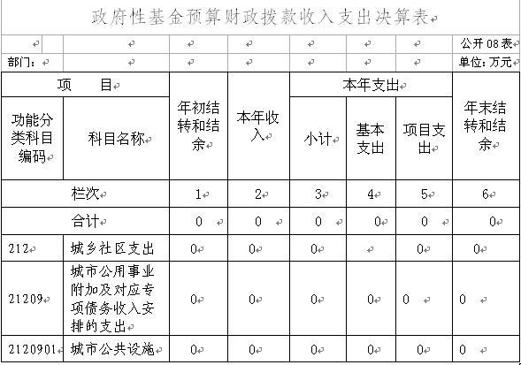 各部门应当公开8张部门决算表格,包括:1.收支总表(3张),即:《收入支出决算总表》、《收入决算表》、《支出决算表》;2.财政拨款收支表(5张),即:《财政拨款收入支出决算总表》、《一般公共预算财政拨款支出决算表》、《一般公共预算财政拨款基本支出决算表》、《财政拨款“三公”经费支出决算表》和《政府性基金预算财政拨款收入支出决算表》。除涉密信息外,《收入决算表》、《支出决算表》、《一般公共预算财政拨款支出决算表》和《政府性基金预算财政拨款收入支出决算表》应当细化公开到支出功能分类项级科目,《一般公共预算财政拨款基本支出决算表》应当细化公开到经济分类款级科目。没有数据的表格也要公开,并在合计栏以零填列。格式如下: