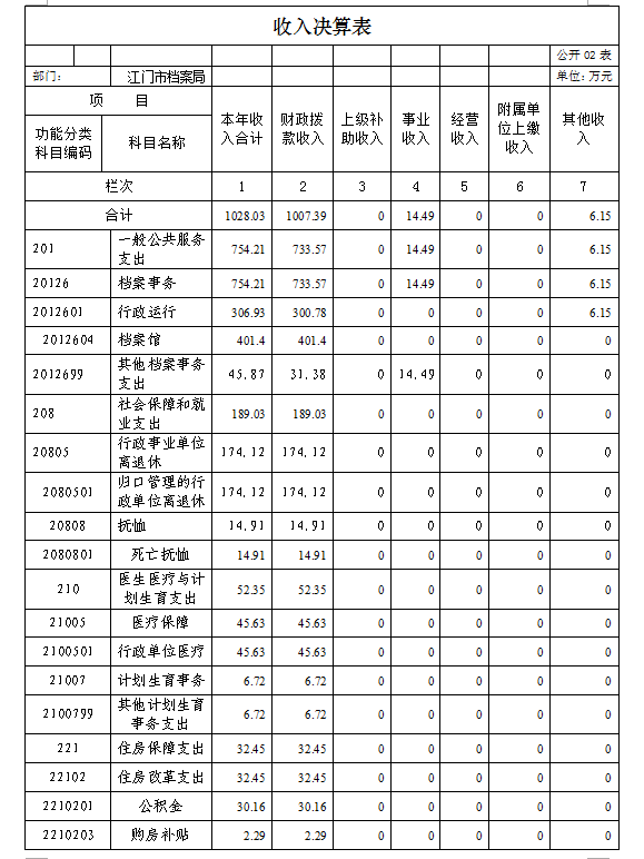 江门市档案局2015年度总收入1,078.72万元,其中本年收入1,028.03万元。具体情况如下: