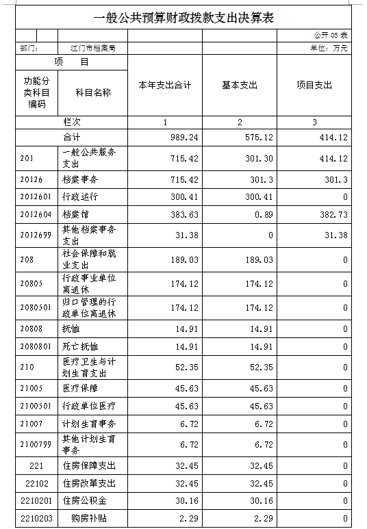 江门市档案局2015年度一般公共预算财政拨款支出989.24万元,具体情况如下: