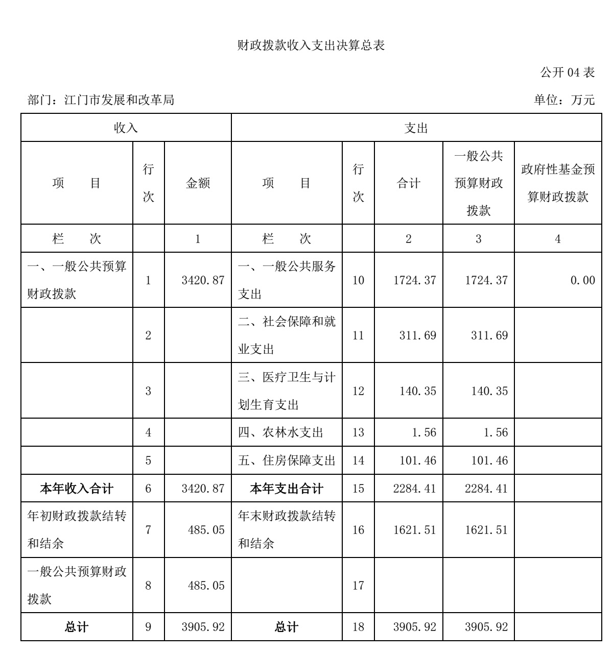 四、财政拨款收入支出决算总表