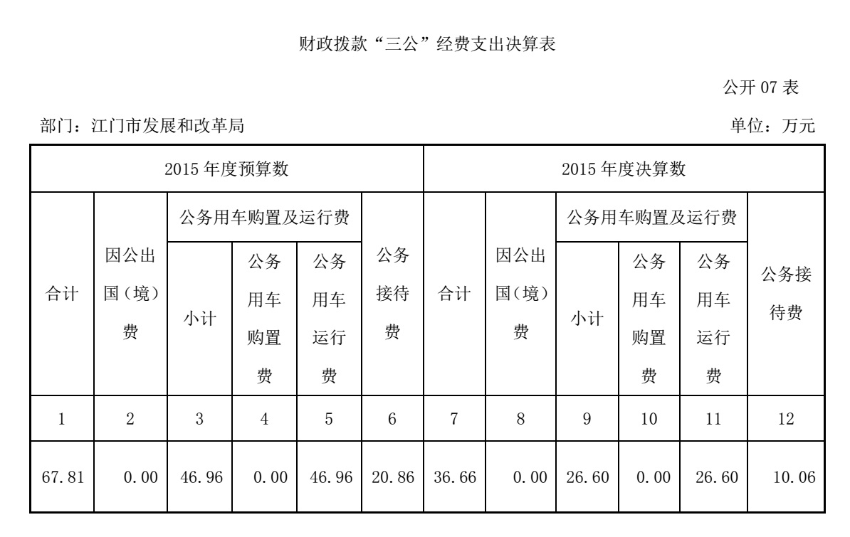 江门市发展和改革局2015年度“三公”经费财政拨款支出决算为36.66 万元,完成预算 67.81万元的54.06 %。其中:因公出国(境)费支出决算为0万元,完成预算0万元的0 %;公务用车购置及运行维护费支出决算为 26.6万元,完成预算46.96 万元的56.64 %;公务接待费支出决算为10.06万元,完成预算20.86万元的48.22 %。2015年度“三公”经费支出决算小于预算数的主要原因是认真贯彻落实中央八项规定精神和厉行节约的要求,从严控制“三公”经费开支,全年实际支出比预算有所节约;