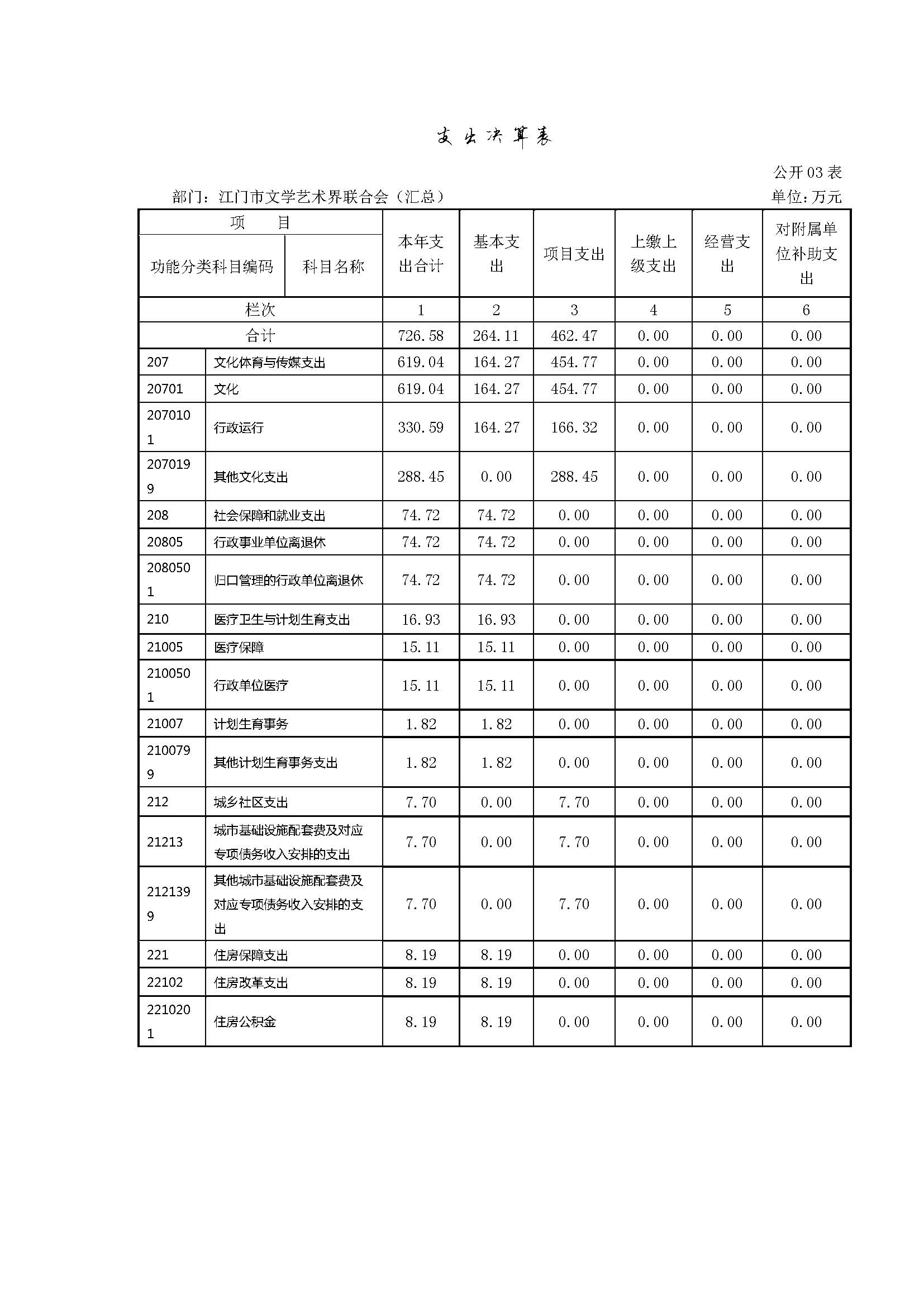 江门市文学艺术界联合会2015年度支出合计 726.58万元。具体如下;