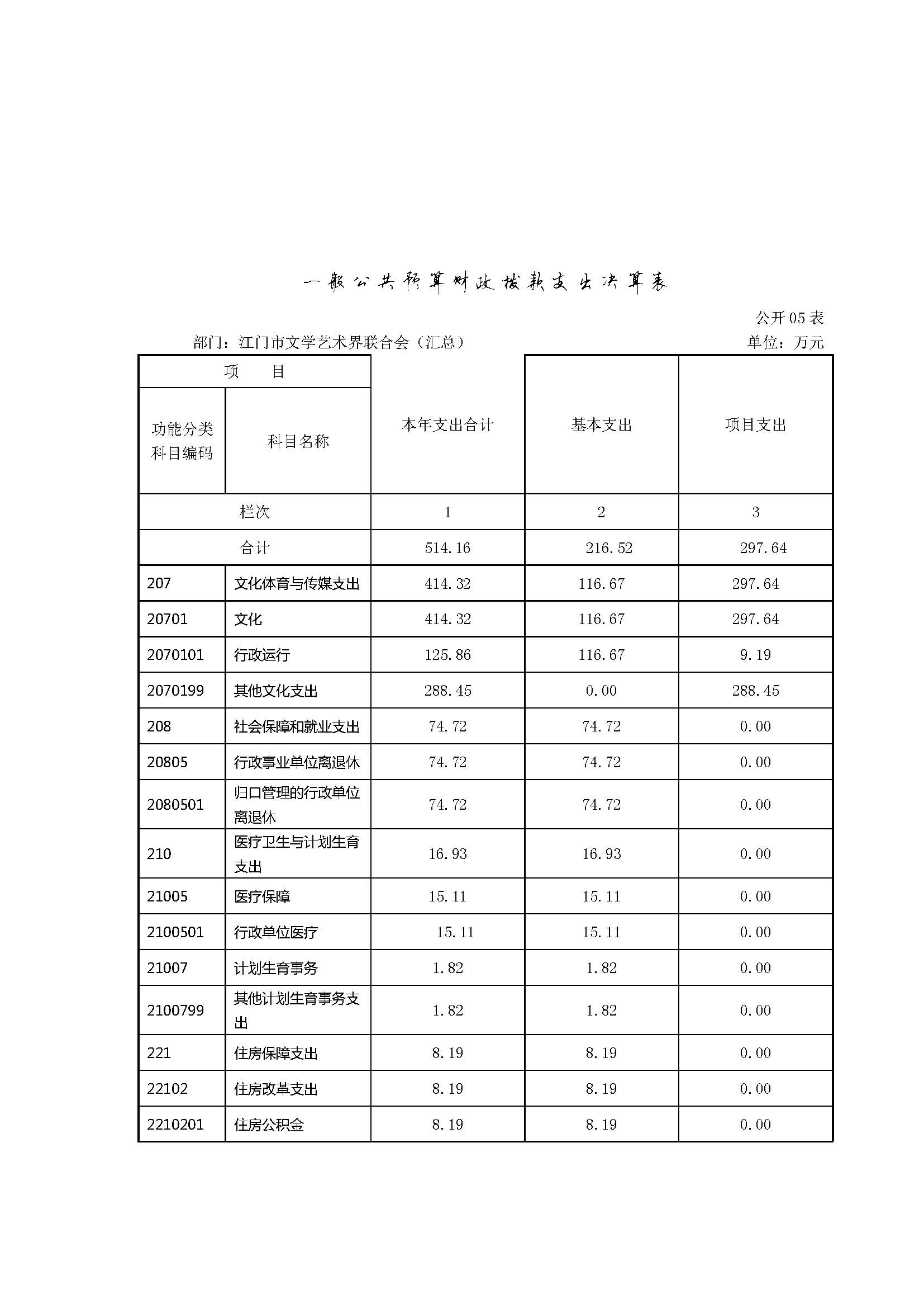 江门市文学艺术界联合会2015年度一般公共预算财政拨款支出 514.16万元,具体情况如下: