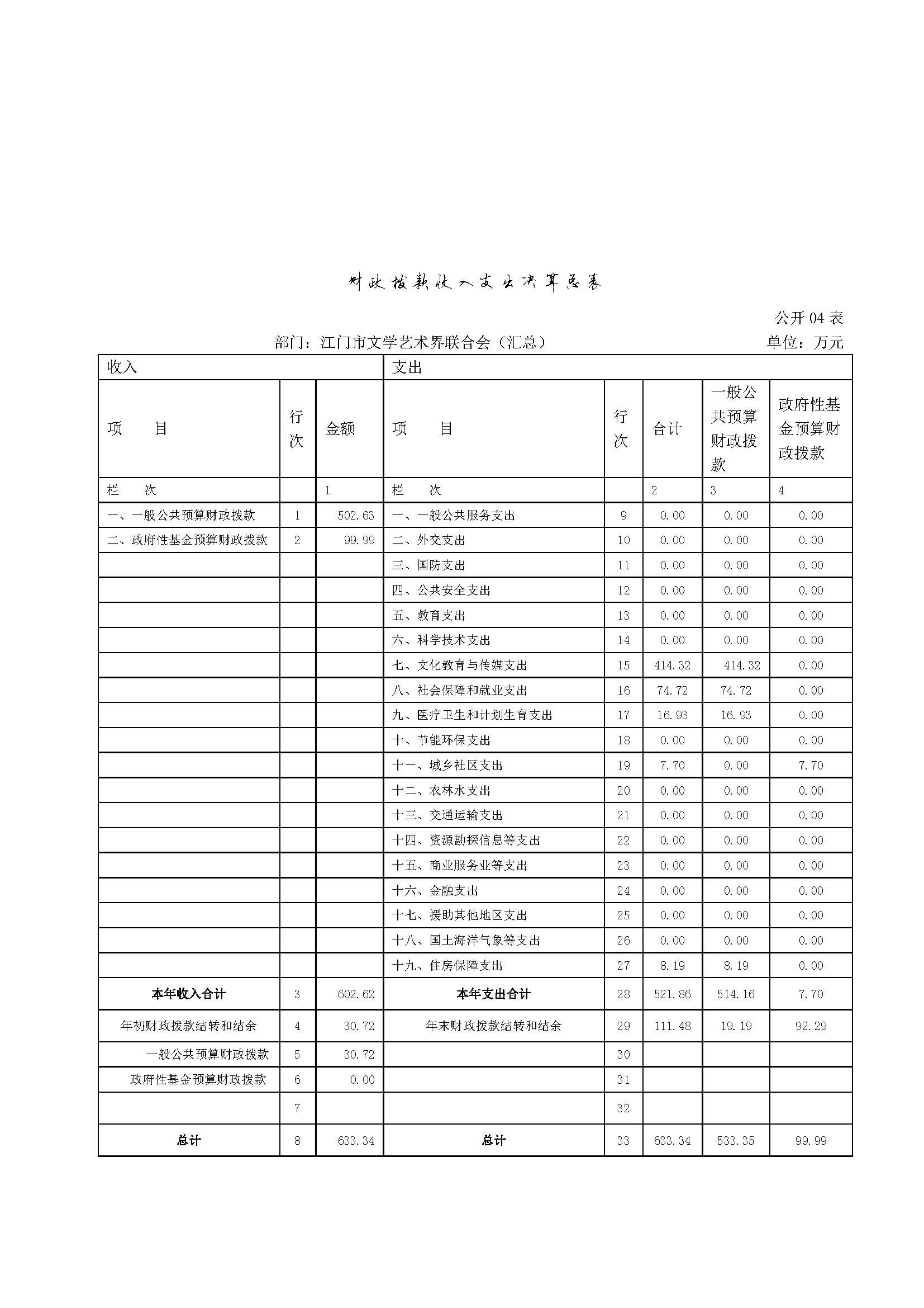 一、收入支出决算总表