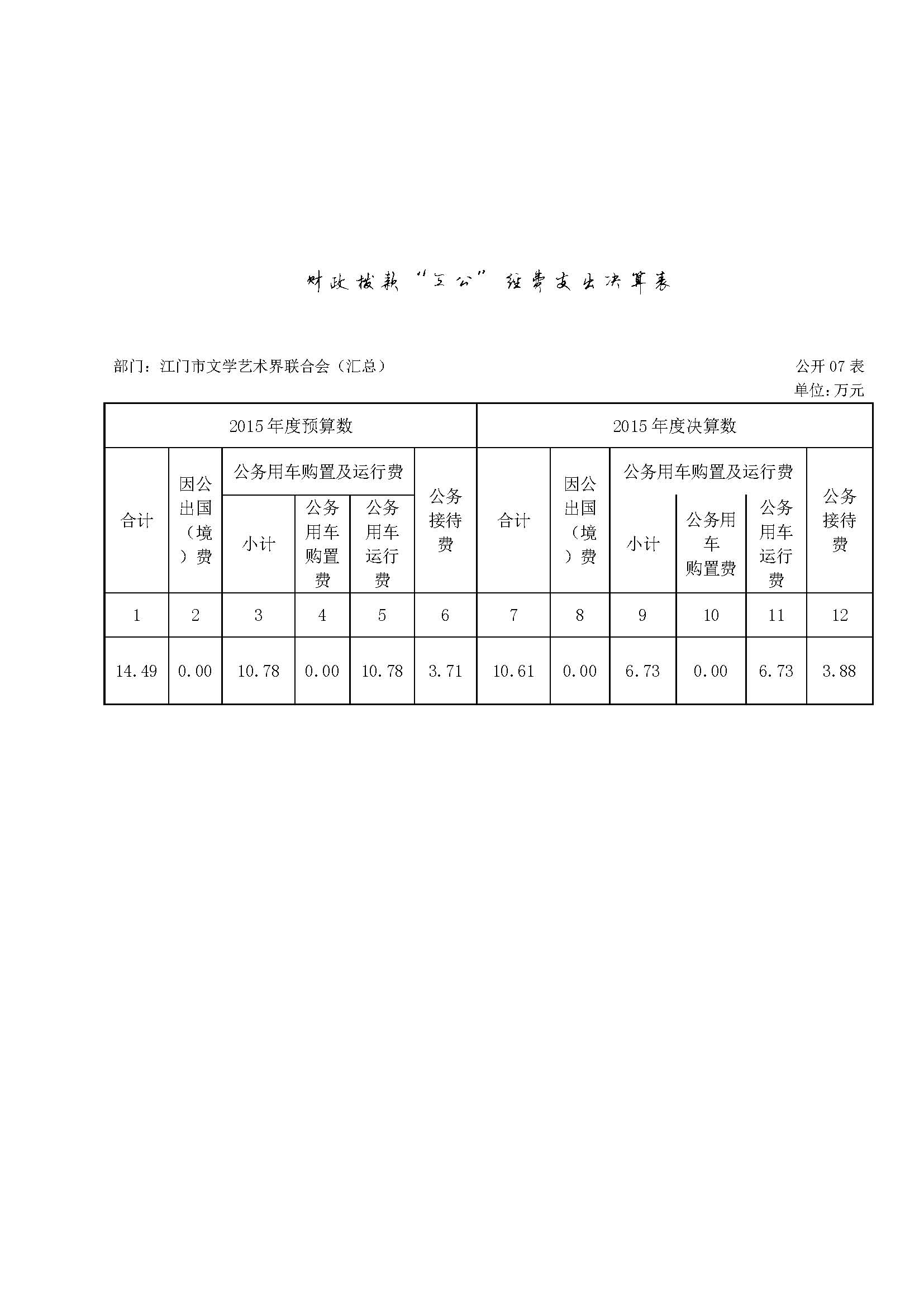 江门市文学艺术界联合会2015年度“三公”经费财政拨款支出决算为 10.61万元,完成预算14.49 万元的 73.22%。其中:因 公出国(境)费支出决算为 0 万元;公务用车购置及运行维护费支出决算为 6.73 万元,完成预算10.78 万元的62.43 %;公务接待费支出决算为 3.88万元,完成预算3.71 万元的104.58 %。2015年度“三公”经费支出决算小于预算数的主要原因是文联及江门书法院都认真贯彻落实中央八项规定精神和厉行节约的要求,同时受公车改革政策 的影响,从严控制“三公”经费开支,全年实际支出比预算有所节约。与2014年相比,2015年度“三公”经费财政拨款支出决算数比2014年减少4.68万元,下降30.61 %。其中:因公出国(境)费支出决算没有增减;公务用车购置及运行维护费支出决算减少3.55万元,下降34.53 %;公务接待费支出决算减少1.13万元,下降22.55%。因公出国(境)费支出没有增减;公务用车购置及运行维护费支出减少主要原因是公车改革,文联减少了一部公车开销;公务接待费支出减少主要原因是文联及江门书法院都认真贯彻落实中央八项规定精神和厉行节约的要求,本年度的实际支出比2014年有所节约。