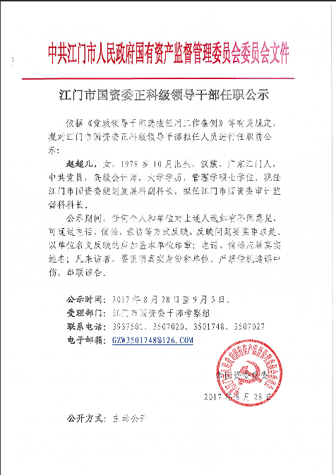 江门市国资委正科级领导干部任职公示_政府信息公开目录_太阳3娱乐