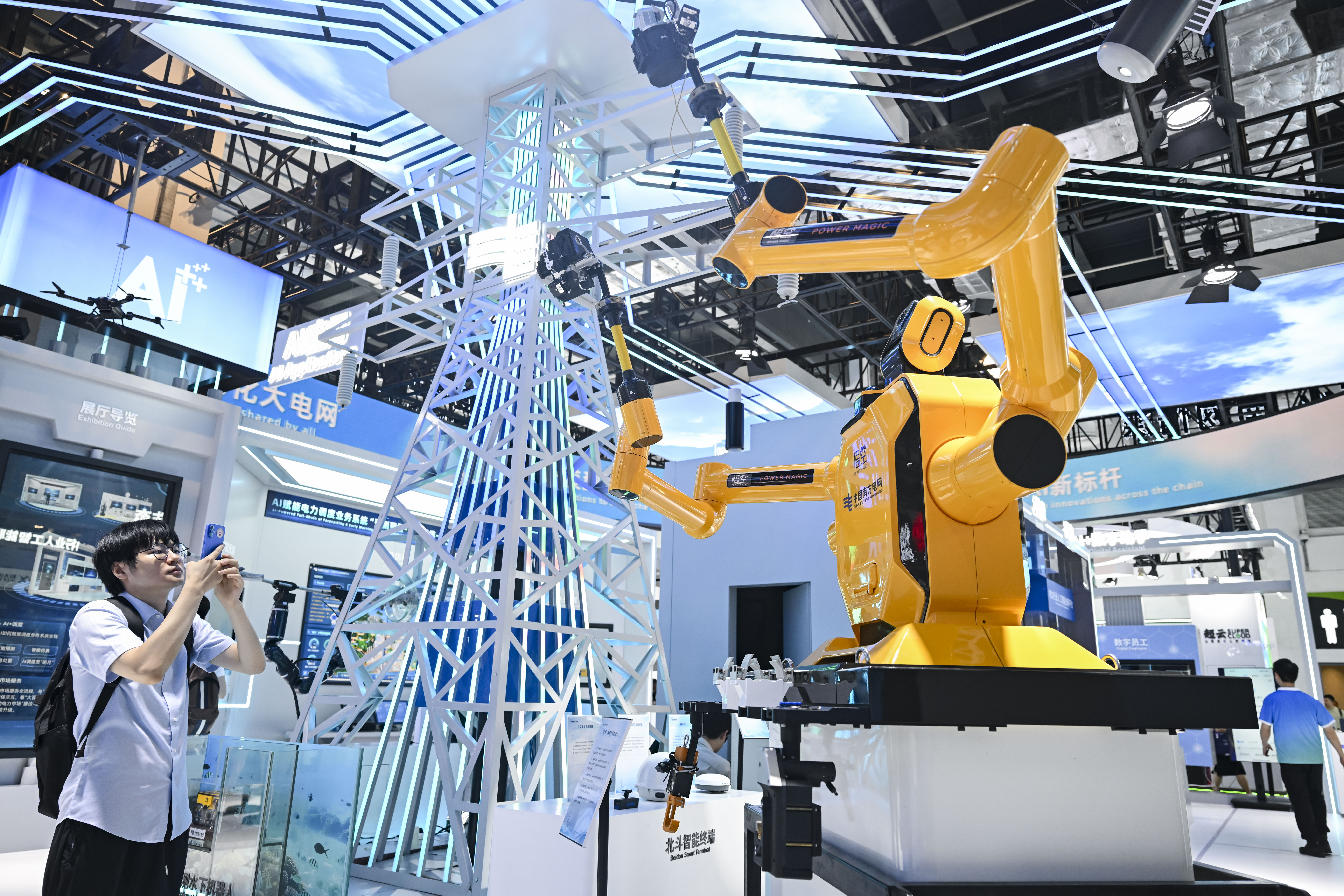 7月28日,在2025世界人工智能大会上,参观者在中国南方电网展区拍摄“悟空”带电作业机器人。新华社记者 陈浩明 摄