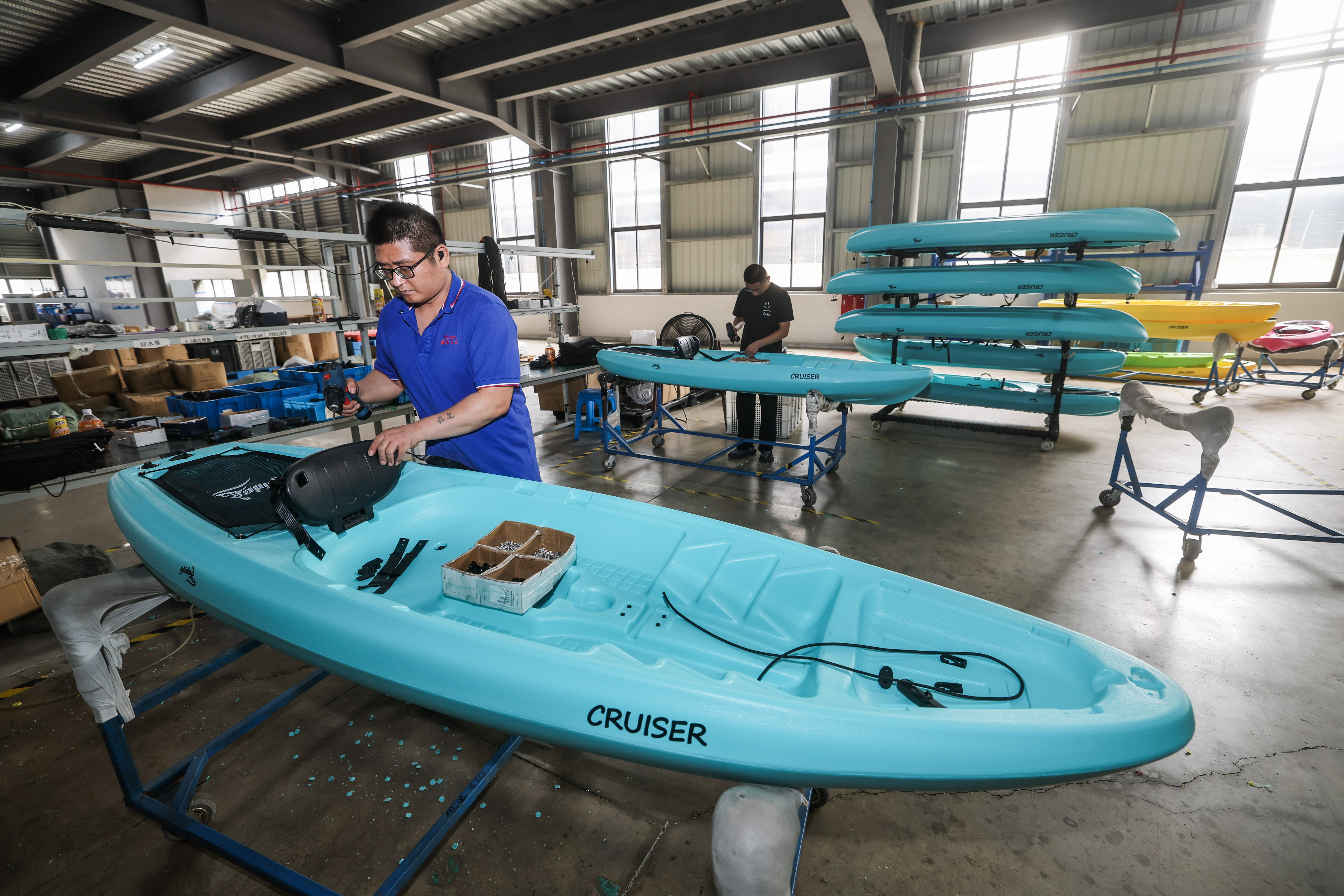 6月25日,在位于慈溪市的浙江酷尔智能科技有限公司的车间内,工人在加工出口的皮划艇。新华社记者 徐昱 摄