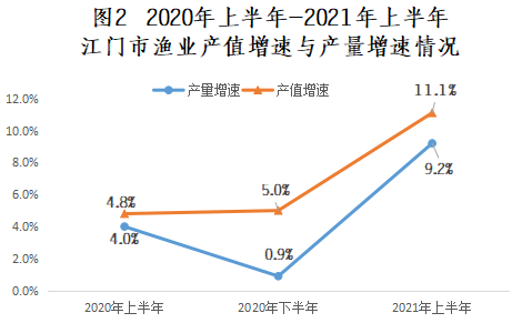 从生产结构看,以虾蟹蚝等高值水产品为主的水产养殖比重不断提高,上半年水产品养殖占比90.7%,比去年同期提高0.2个百分点,比2019年上半年(88.9%)提高1.8个百分点;从生产质效看,去年以来渔业产值增速逐步提升,产值增速总体高于产量增速。