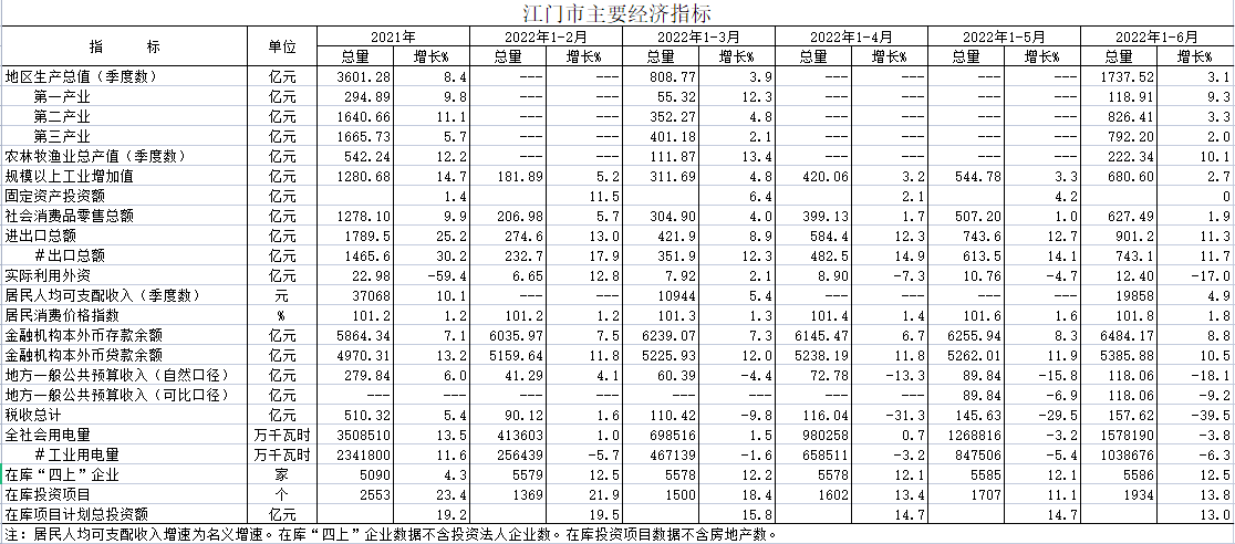 2022年上半年江门市主要经济指标_统计月报_太阳3娱乐