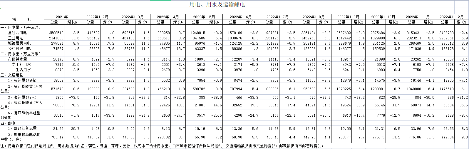 2022年12月用电、用水及运输邮电
