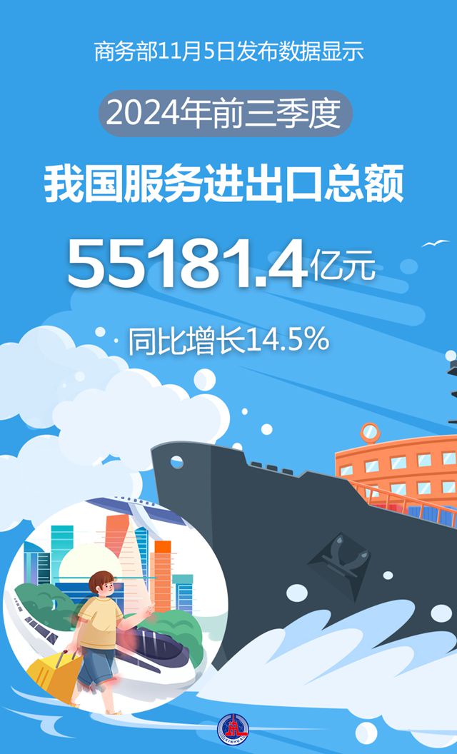 商务部11月5日发布数据显示,2024年前三季度,我国服务进出口总额55181.4亿元,同比增长14.5%。