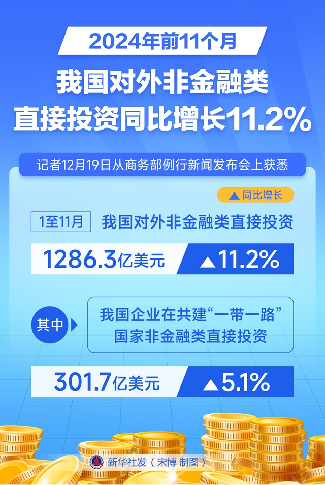 记者12月19日从商务部例行新闻发布会上获悉,1至11月,我国对外非金融类直接投资1286.3亿美元,同比增长11.2%。其中,我国企业在共建“一带一路”国家非金融类直接投资301.7亿美元,同比增长5.1%。