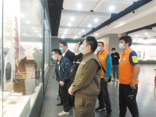 近20名快递小哥参观江门五邑银信(侨批)专题展,图为他们正在了解巡城马的相关资料。