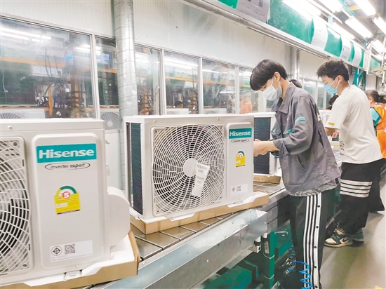 以实干开创更加美好的未来。图为海信工人在车间工作。
