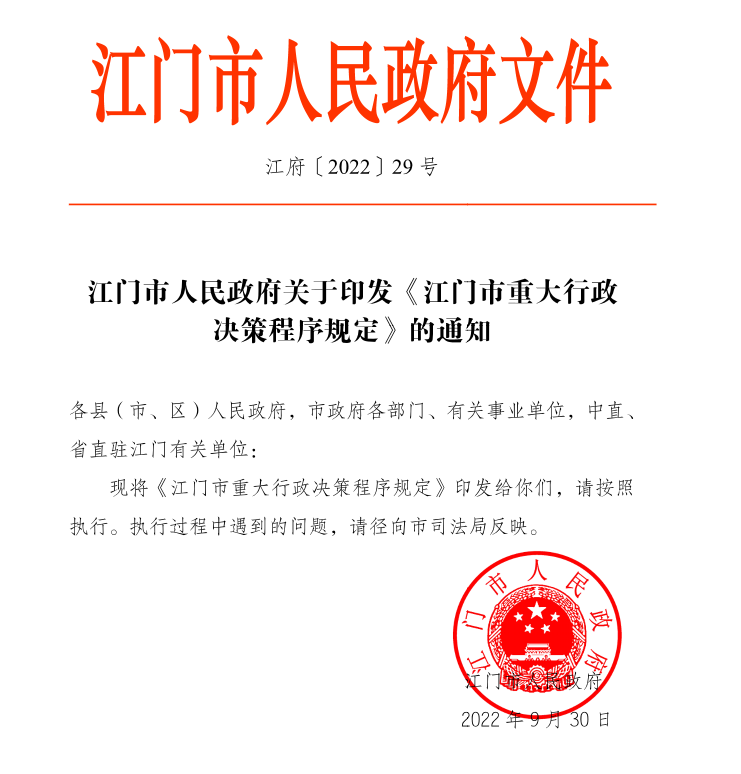一是严格履行重大行政决策程序。将依法决策作为建设一流法治政府和一流营商环境的重要举措。修订《江门市重大行政决策程序规定》,并印发配套指引,严格规范重大行政决策法定程序。二是严格做好行政规范性文件制发和管理工作。修订《江门市行政规范性文件管理规定》,并印发详细配套指引。依法制定规范性文件,严禁越权发文、严控发文数量、严格制发程序。建立健全行政规范性文件制定协调机制,防止政出多门、政策效应相互抵消。全面落实规范性文件合法性审核机制、动态清理工作机制、备案审查制度。三是严格规范公正文明执法。有序推进包容审慎监管方式,推动行政执法减免责清单制度,依法规范行政执法行为,防止“一刀切”。抓好道路交通安全和运输执法领域突出问题等专项整治工作,通过专项督察推动依法行政能力全面提高。四是健全社会矛盾纠纷多元化解机制。巩固行政复议体制改革成果,强化行政复议监督功能,充分发挥行政复议化解行政争议主渠道作用。进一步发挥司法所的“小所大作用”,持续提升人民调解水平。建立健全行政调解、人民调解与司法调解衔接联动机制。五是不断提升公共法律服务质效。不断丰富公共法律服务平台服务内涵,助力实施“侨都赋能”工程。强化市县联动,将深国仲江门中心打造成为珠江口西岸商事争议解决服务优选地。注重用好国字号的立法联系点,不断创新公众参与立法形式,使其成为江门发展全过程人民民主的金字招牌。