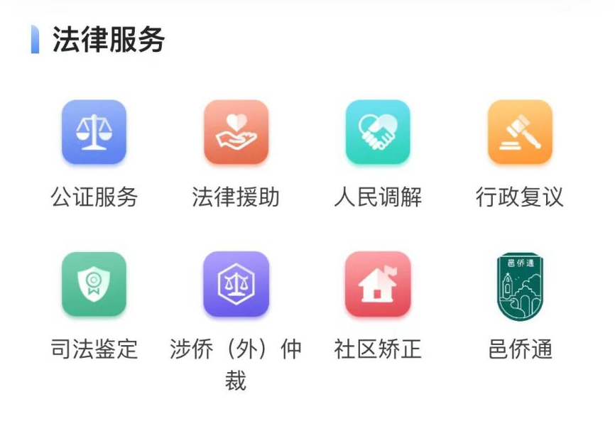 主要包含八个功能板块:公证服务、法律援助、人民调解、行政复议、司法鉴定、涉侨(外)仲裁、社区矫正及对接了“邑侨通”小程序。群众可以在线上按照提示步骤在线办理业务,具体的业务办理需要对接到线下实体窗口。
