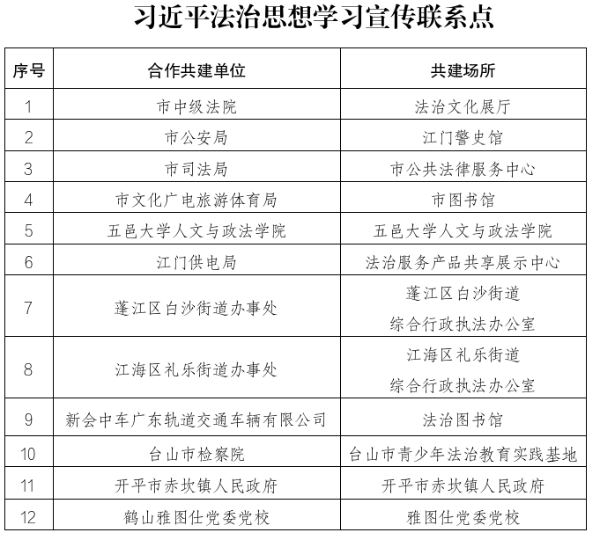 十四届全国人大常委会第十七次会议表决通过了《中华人民共和国法治宣传教育法》,自2025年11月1日起施行,“习近平法治思想”首次入法,并作为法治宣传教育的首要任务。为推进习近平法治思想学习宣传融入法治实践、基层治理和日常生活,江门市委依法治市办聚焦实效,分批次有重点渐进式地建设了12个习近平法治思想学习宣传联系点,持续推进习近平法治思想学习宣传向基层延伸,向群众贴近。