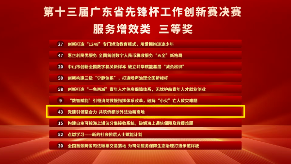 近日,在第十三届广东省“先锋杯”工作创新赛决赛中,江门市司法局参赛项目《党建引领聚合力 共筑侨都涉外法治新高地》在全省省直、中直驻粤单位以及21个地市的5000多个优质项目中脱颖而出,获得决赛三等奖。